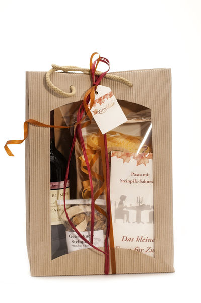 ist eines unserer beliebtesten Geschenke: Es besteht als Basis aus getrockneten Steinpilzen, Pasta, Wein und einem Rezept für eine Steinpilz-Sahnesoße mit dem Titel: "Ein kleines Essen für Zwei" und passt so in eine Geschenktasche aus Welle-Karton.